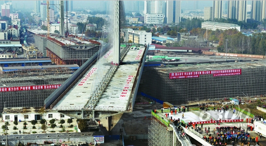 山东菏泽丹阳路立交桥的转体施工和斜拉成品索挂索施工,均由欧维姆公司负责。立交桥转体长度238米,上跨京九铁路、新兖铁路及菏泽货场8股铁道,转体重量达2.48万吨。