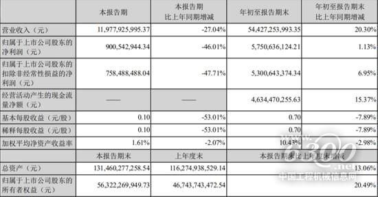 10月28日,中联重科股份有限公司发布第三季度报告。报告称,公司第三季度实现营收119.78亿元,同比下降27.04%,实现归属于上市公司股东的净利润9.01亿元,同比下降46.01%。