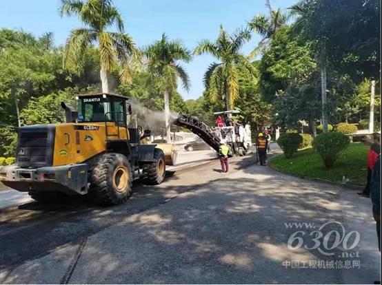 树影斑驳里,加水车给铣刨机水箱加水,山推装载机在后面跟着进行旧料回收,两个设备一前一后,引来不少市民驻足围观,“快看,全都是山推的设备,咱这路面修的可快了,不久就能通车啦!”