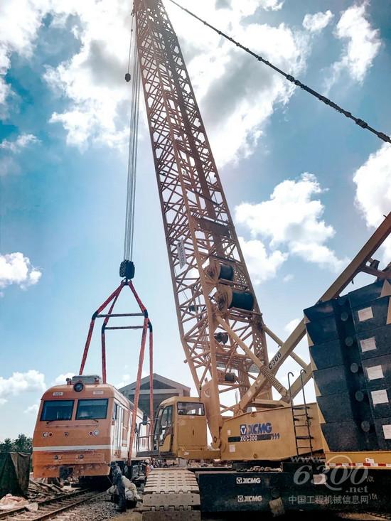 在几内亚共和国达圣铁路干线上,徐工XGC300履带起重机先后将四台交流传动内燃机车车头吊起,配合中车集团完成组装任务,提速“一带一路中非共建项目”建设。