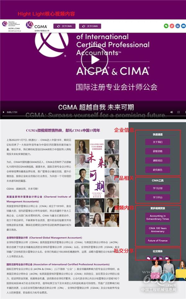 再来看另一个常见场景:一位读者,可能是产品用户,也可能是投资者,他在某网站阅读到一篇企业新闻内容后,对该企业产生了进一步了解的兴趣。此时他往往不得不辗转好几个途径,打开若干个页面,去搜寻查看企业信息。此时如果我们将这篇容易引发用户兴趣的新闻页面中,直接嵌入更多企业相关内容板块,如企业历史、核心产品、研发团队、社交分享等等,是不是就有效提升了阅读体验和信息直达的效率?比如下面的案例来自CIMA,作为进入中国15周年的重要节点,该组织发布了一支视频创意,新闻稿的核心目的正是吸引用户观看视频。此外作为一个相对重要的时间节点,这篇新闻的历史价值也很高,需要额外的重视。企业可以将这次沟通,作为一个受众了解企业的契机。下面就是这篇“多媒体新闻稿”最终的呈现: