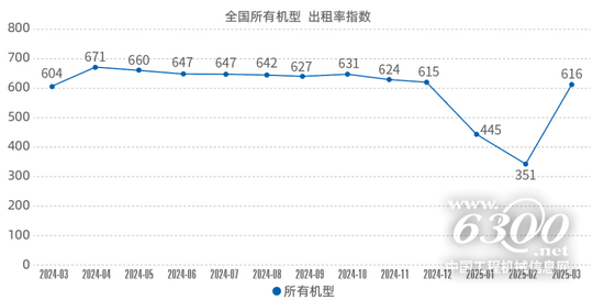 2025年3月升降工作平台出租率指数为616点,环比上涨76.4%,同比增长2.5%。由于2月份春节假期,因此出租率指数环比变化较大。总体看3月份所有机型环比出租率指数均处于增长状态,其中20~24m机型环比涨幅最大,达到84.8%,14~16m机型涨幅最小为63.8%。 2025年3月各机型出租率指数同比有涨有跌,分化比较明显, 40m以上机型涨幅最大,达到15.2%,≤6m机型同比降幅最大为6.4%(出租率是以台天数为基准进行计算,100%出租率对应1000点。)