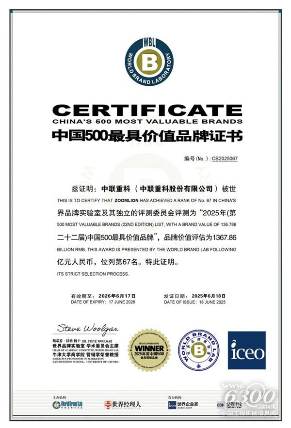 6月18日,由世界品牌实验室(World Brand Lab)主办的第22届世界品牌大会在北京举行,会上发布了2025年《中国500最具价值品牌》分析报告,中联重科以1367.86亿元品牌价值登榜,在去年基础上再次提升111.15亿元,稳健高质量发展成效显著。