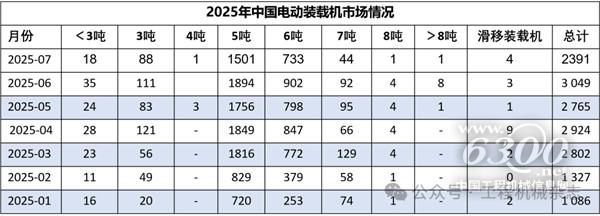 2025年7月销售电动装载机2391台( 3吨以下18台,3吨88台,4吨1台,5吨1501台,6吨733台,7吨44台,8吨1台,8吨以上1台,滑移装载机4台)。