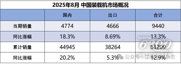 据中国工程机械工业协会对装载机主要制造企业统计,2025年8月销售各类装载机9440台,同比增长13.3%。其中国内销量4774台,同比增长18.3%;出口量4666台,同比增长8.69%。