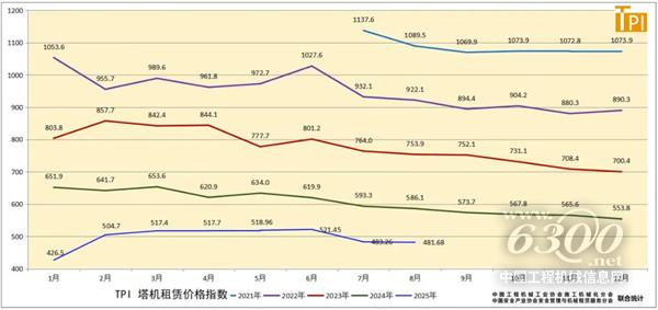 据中国工程机械工业协会施工机械化分会等统计的塔机租赁行业景气指数(TPI),2025年8月份塔机台天利用率57.6%,最大起重力矩利用率56.7%,分别较上月高0.4个百分点和低0.2个百分点;8月份租赁价格指数为481.68点,较上月低1.58点,低于去年同期104.42点。