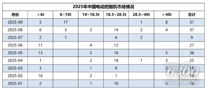 2025年9月销售电动挖掘机31台(6吨以下5台,18.5至28.5吨级17台,28.5至40吨级1台,40吨级以上8台)。