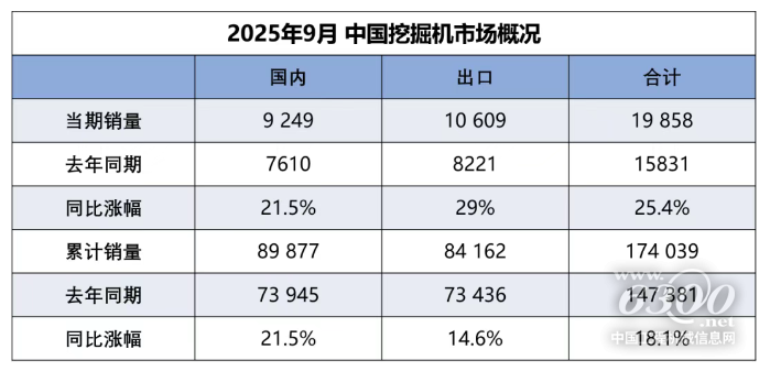 据中国工程机械工业协会对挖掘机主要制造企业统计,2025年9月销售各类挖掘机19858台,同比增长25.4%。其中国内销量9249台,同比增长21.5%;出口量10609台,同比增长29%。