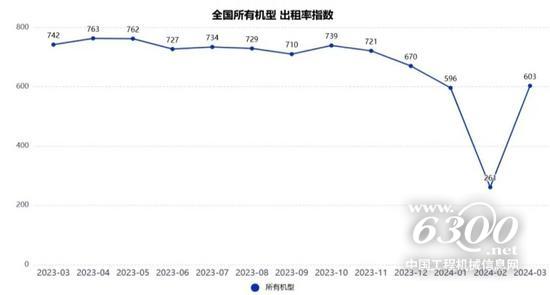 2024年3月升降工作平台出租率指数为603点,环比上涨131.0%、同比下降18.7%。由于2024年春节假期在2月份,因此3月份出租率指数增幅较大,所有机型环比都处于增涨状态。与之相反的是2024年3月同比所有机型均处于下滑态势,其中14-16m机型降幅最大,达到26.1%。(出租率是以台天数为基准进行计算,100%出租率对应1000点。)