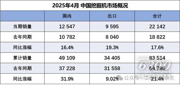 据中国工程机械工业协会对挖掘机主要制造企业统计,2025年4月销售各类挖掘机22142台,同比增长17.6%。其中国内销量12547台,同比增长16.4%;出口量9595台,同比增长19.3%。