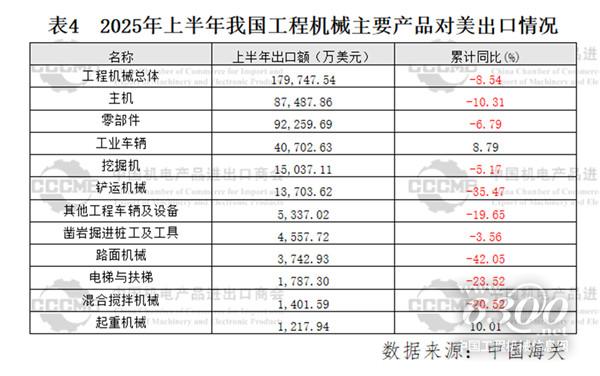 上半年我对美工程机械累计出口18亿美元,同比下降8.5%,延续了自2023年以来逐年下滑的态势。从出口品类看,主机中仅占比最高的工业车辆和占比最低的起重机械仍保持一定增长,其他品类出口额均同比下降,其中铲运机械和路面机械降幅均超过35%。