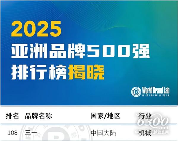 9月24日,世界品牌实验室(World Brand Lab)发布2025年(第二十届)《亚洲品牌500强》年度报告,共有20个国家和地区的超级品牌入选。三一以中国排名54,亚洲排名108的名次成功上榜,并摘得中国工程机械品牌桂冠。