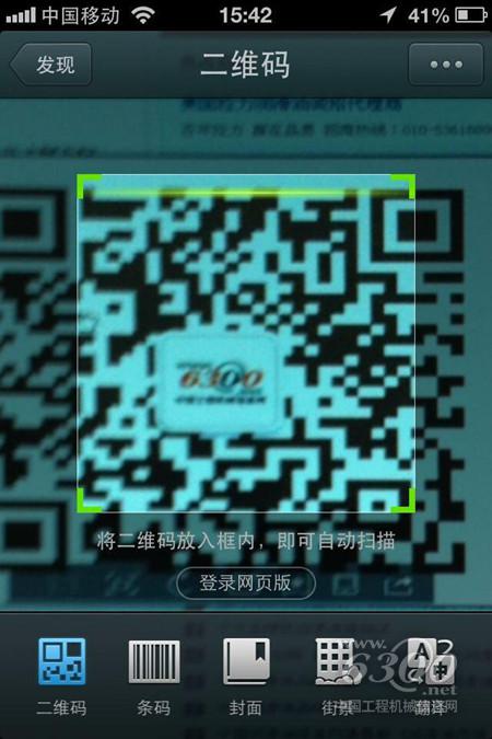 2.在‘扫描二维码’页内,将【摄像头对准中国工程机械信息网官方微信二维码】从上到下扫描,效果如下图:
